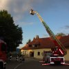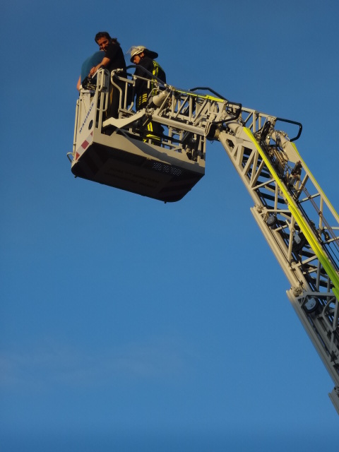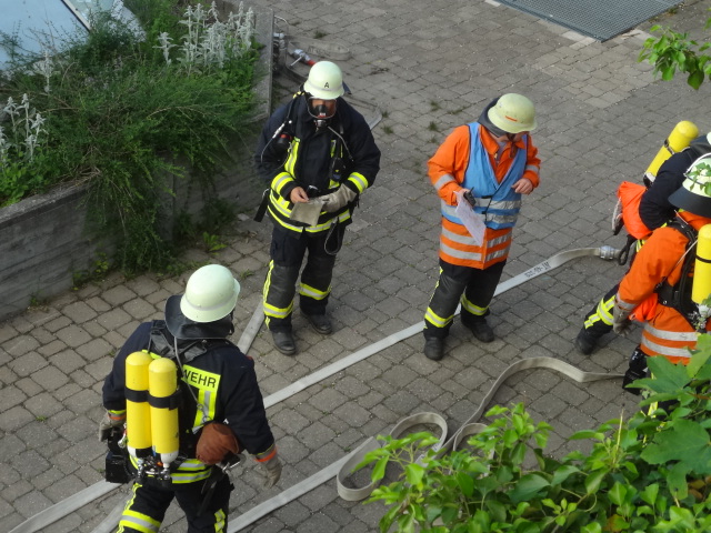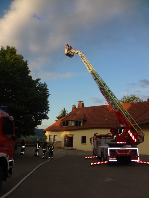 Um 20 Uhr wurde sozusagen der Alarm ausgelöst und bald schon wimmelte es von uniformierten Männern und Frauen mit und ohne Gasmasken vor allem rund um das Haus Reussenstein und die Wohngruppe Heimenstein. Insgesamt waren drei Löschfahrzeuge und dazu die große Drehleiter im Einsatz. Schnell und effektiv wurden die Kinder und Jugendlichen der Wohngruppe über die Fenster in Sicherheit gebracht und unter dem Beifall der Zuschauer aus den anderen Gruppen wurden die Erzieher noch auf einen kleinen „Rundflug" in atemberaubender Höhe mit der Drehleiter mitgenommen. Nach einer Stunde war der „Spuk" vorüber und nachdem auch noch das Löschwasser aus unserem Teich ins Tal gespritzt wurde, konnte festgestellt werden, dass alle Beteiligten für einen Ernstfall, der hoffentlich nie kommen wird, bestens gerüstet sind!