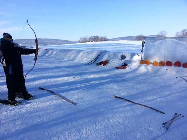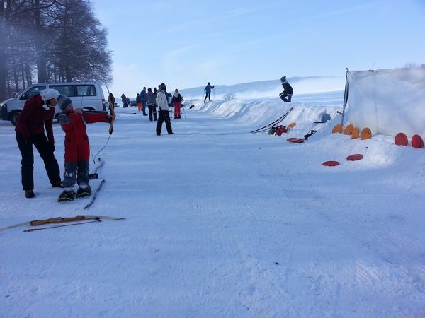 Neben Klassikern wie Rodeln, Ski- und Snowboardfahren am eigens dafür geöffneten Skilift Ochsenwang konnten Kinder und Erwachsene auch noch Biathlon oder Spiele im Schnee machen. Beim Biathlon ging es darum, mit Schneeschuhen zwei doch recht anspruchsvolle Runden durch den tiefen Schnee zu ziehen und dazwischen mit Pfeil und Bogen auf Gummiteller zu schießen. Für jeden Fehlschuss wurde eine Strafrunde fällig, so dass einige der Kinder und Jugendlichen ordentlich ins Schwitzen kamen! Den Sieg trug dann Tarek Burz davon, der in beiden Runden Fehlerlos blieb!
